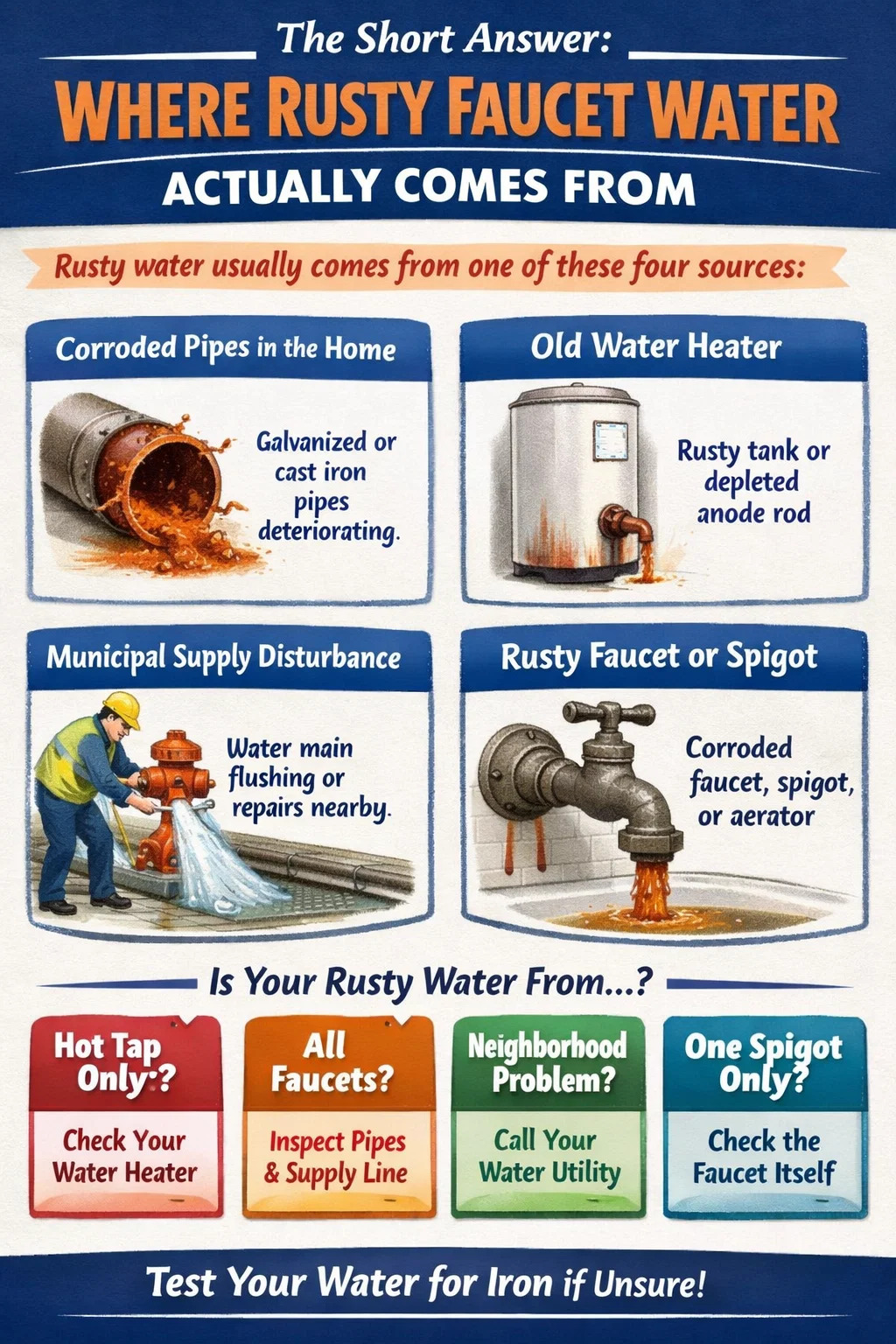 Rostiges Wasser aus Wasserhähnen wird fast immer durch eine von vier Ursachen verursacht: korrodierte Eisen- oder Stahlrohre in Ihrem Haus, einen sich verschlechternden Warmwasserbereiter, Sedimentstörungen in der städtischen Versorgungsleitung oder ein oxidierter Zapfhahn oder eine oxidierte Vorrichtung an der Entnahmestelle. Der orange, braune oder rötliche Farbton, den Sie sehen, ist Eisenoxid – Rost –, der entweder aus dem Inneren der Rohre abgeplatzt ist und in den Wasserstrom gelangt ist oder sich direkt im Wasser aufgelöst hat, während es durch die alternde Infrastruktur fließt.