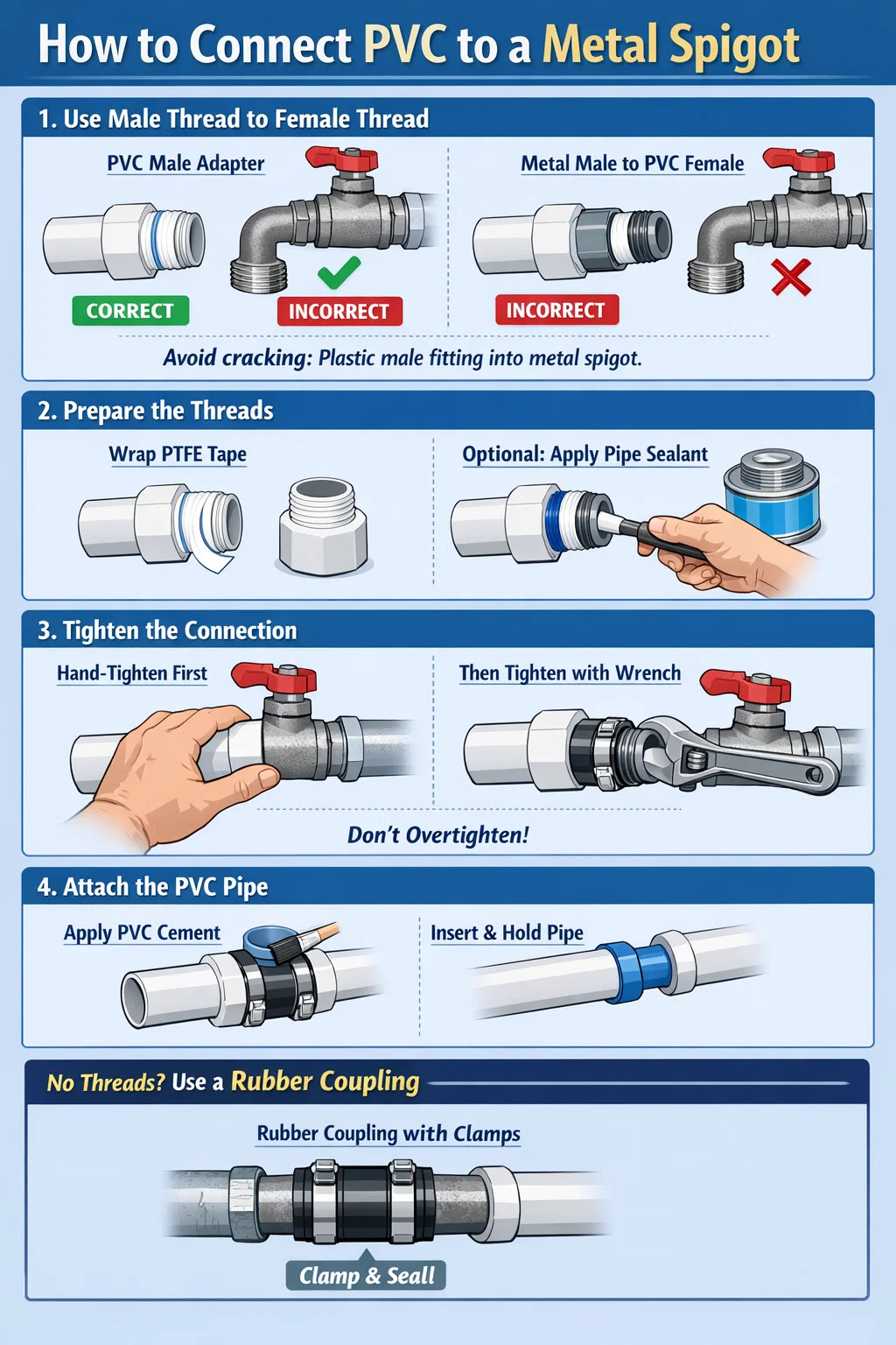 Der Anschluss von PVC-Rohren an einen Metallstutzen (Metallhahn oder -ventil) ist eine häufige Aufgabe bei der Reparatur von Hausinstallationen. Aufgrund der unterschiedlichen Härte und thermischen Ausdehnungs-/Kontraktionsraten von Kunststoff und Metall ist beim Anschließen besondere Sorgfalt erforderlich, um Undichtigkeiten oder Risse in den Anschlüssen zu vermeiden.