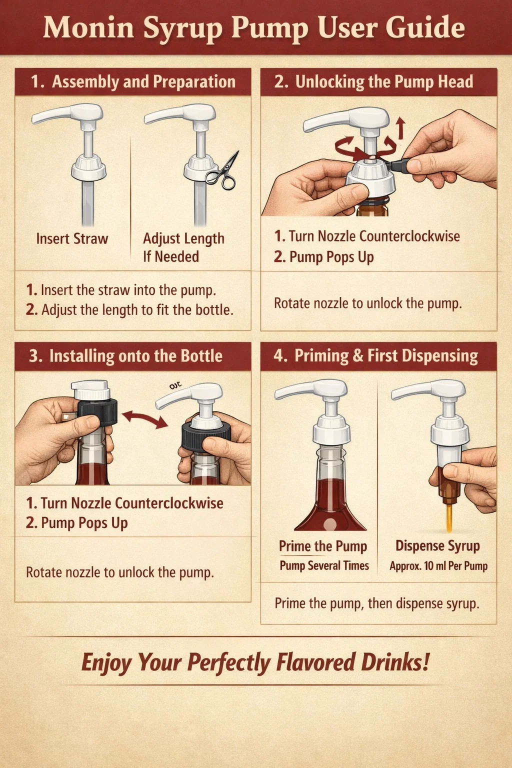 Bei der Siruppumpe von Monin, einem klassischen Bargerät, sorgt die richtige Verwendung dafür, dass Ihre Getränkezubereitung reibungsloser verläuft und die Qualität des Sirups besser erhalten bleibt.