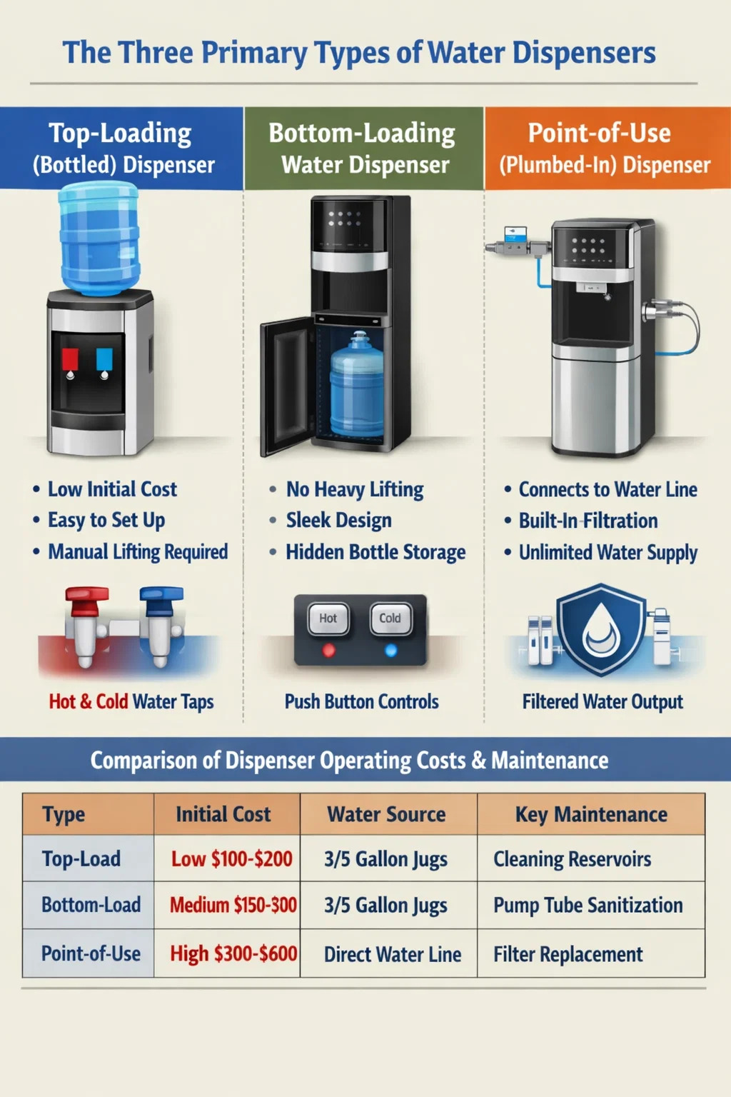 Bei der Bewertung von Trinklösungen für zu Hause oder im Büro werden Wasserspender je nach Lademechanismus und Wasserquelle im Allgemeinen in drei verschiedene Typn eingeteilt: Von oben beladbare (Flaschen-)Spender, von unten beladbare Spender und Point-of-Use-Spender (mit Wasseranschluss). Jedes System verwendet ein bestimmtes wasserspender wasserhahn Konfiguration zur Steuerung des Durchflusses. Die Auswahl der richtigen Konfiguration hängt von Ihrem physischen Platz, Ihrem Budget und dem gewünschten Wartungsniveau ab.