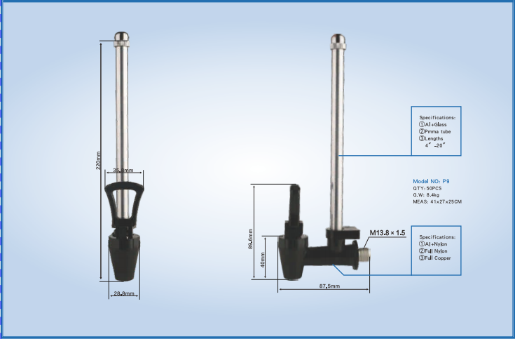 Das Sichtrohr, der Zapfen, die Unterlegscheibe und die Mutter bestehen alle aus BPA-freiem Material. Der äußere Schutz für das Rohr besteht aus leichtem Aluminium. Sie verleihen dem gesamten Produkt eine stärkere, haltbare Struktur und sind trinkbar.
