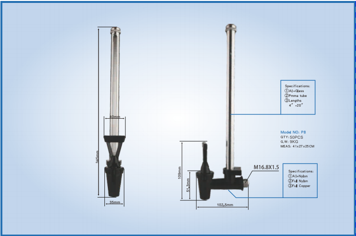 Das Sichtrohr, der Zapfen, die Unterlegscheibe und die Mutter bestehen alle aus BPA-freiem Material. Der äußere Schutz für das Rohr besteht aus leichtem Aluminium. Sie verleihen dem gesamten Produkt eine stärkere, haltbare Struktur und sind trinkbar.